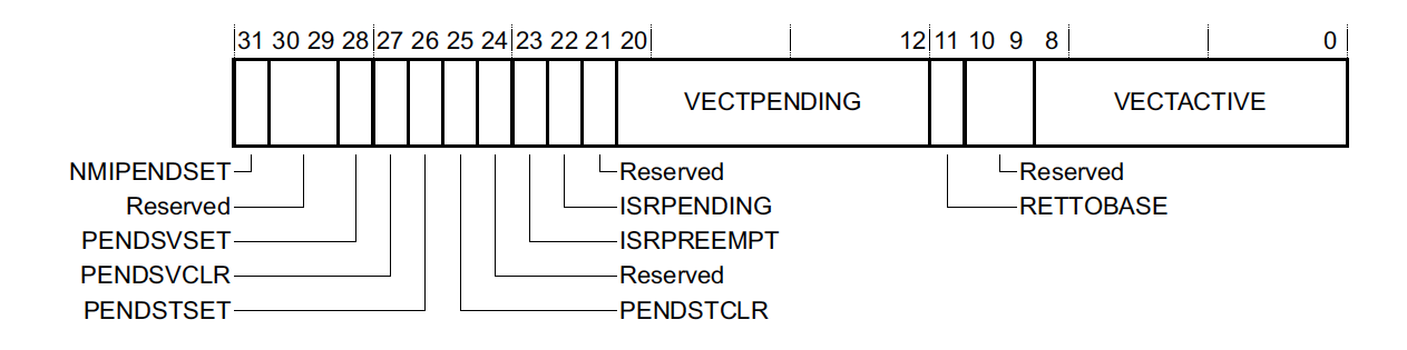 IPSRfield of the Program Status Register (xPSR). - RETTOBASE - A value of 0 means another interrupt is active aside from the currently executing one. This basically reveals whether or not pre-emption took place. This field is not implemented in ARMv6-M devices.