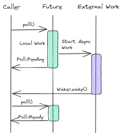 To advance the state of our future we could call poll repeatedly until we get a Ready status, but that seems rather inefficient. If our Future is dependent on an external I/O event, looping over calls to poll keeps our processor awake and wastes precious power. This observation brings us to the only argument passed into the poll function, the future Context. The Context only has one role, to provide access to the Future’s Waker.