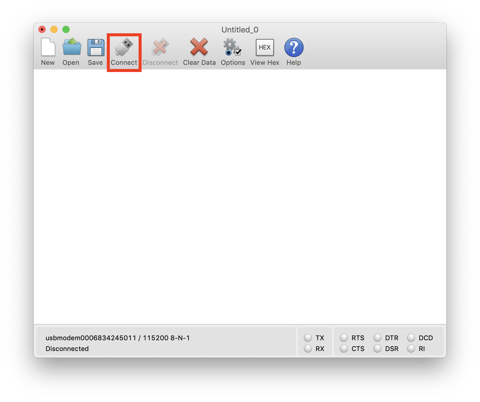 • Finally, connect to the serial port by clicking the “Connect” button: