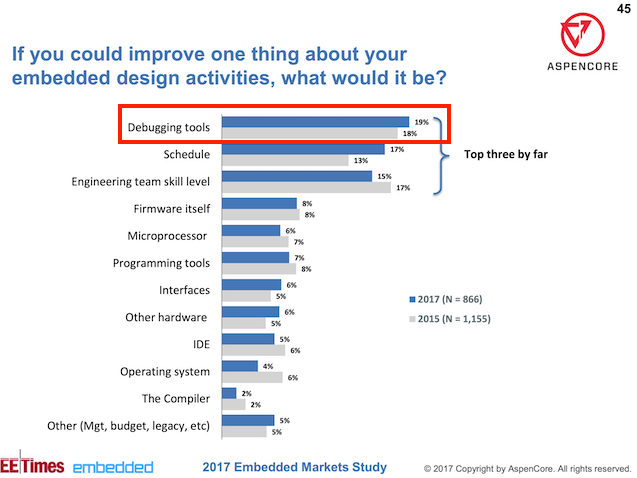 I’ll leave you with a few figures taken from the 2017 Embedded/EETimes Embedded Markets Study survey which showcase the significance of debugging in the professional life of a firmware developer.