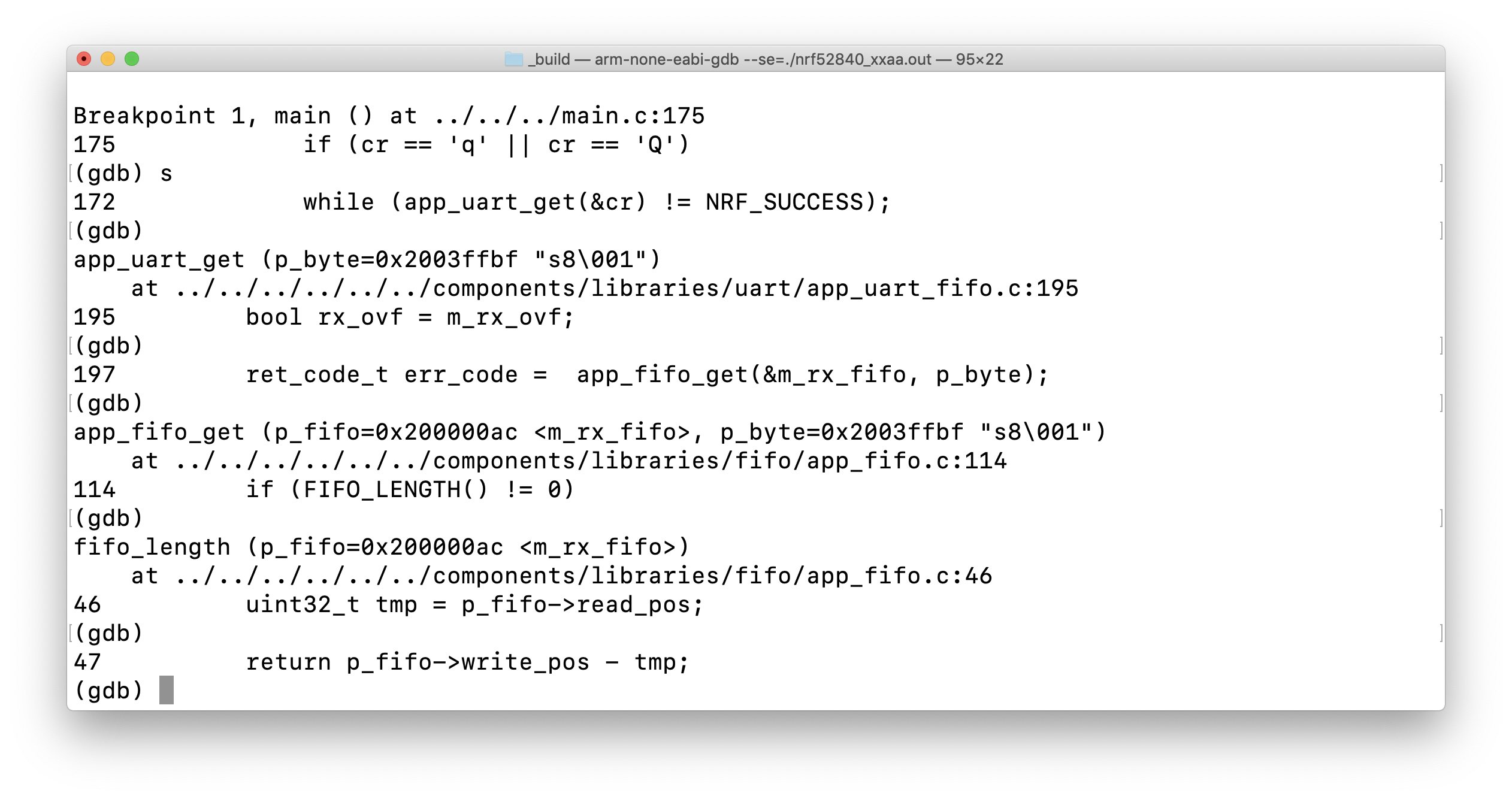 Notice that GDB stepped into the function app_uart_get() after reaching line 172.