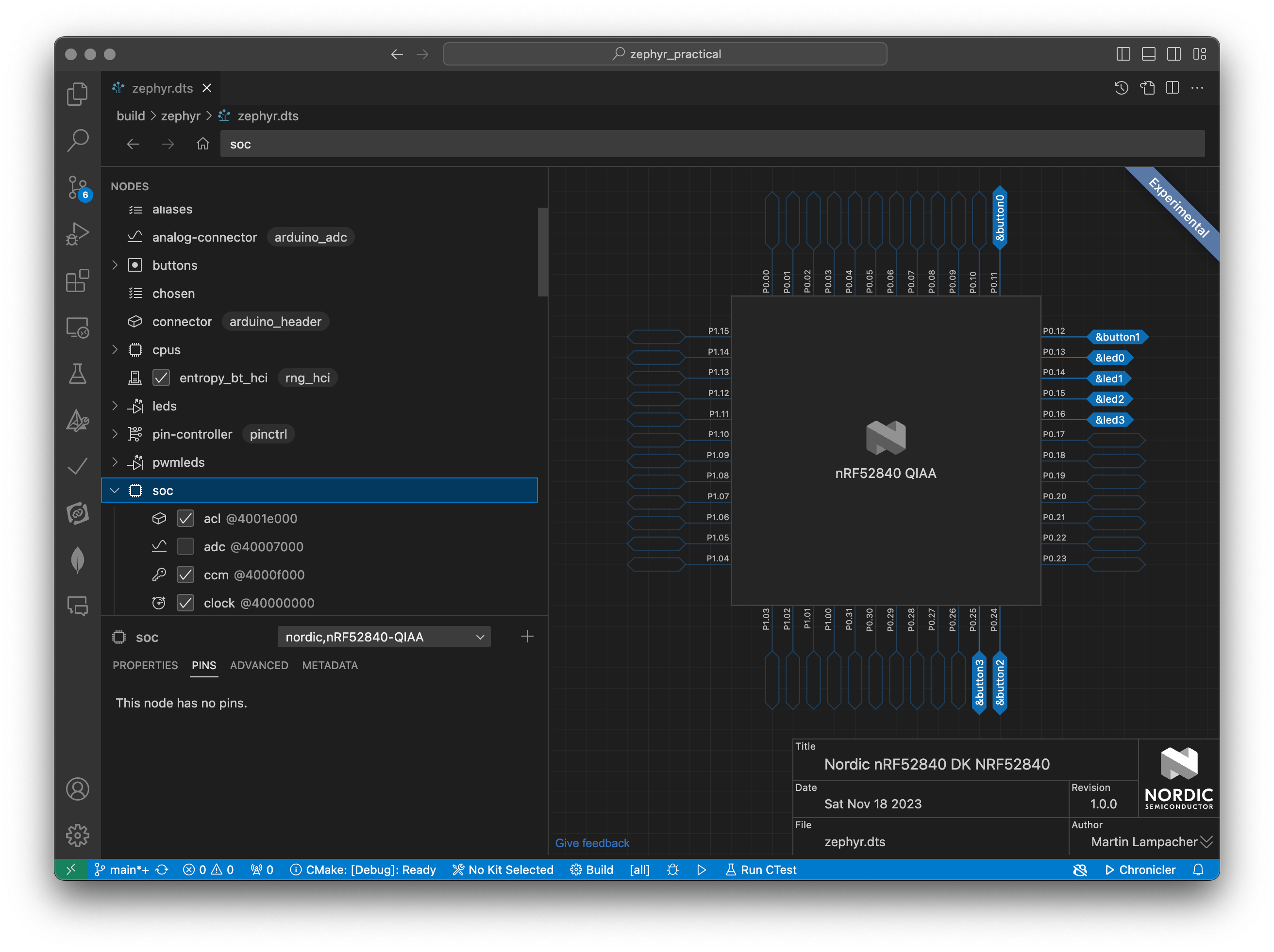 Since we’re practicing, however, we’ll use a /chosen node called app-led instead. We add this node using a new board overlay file boards/nrf52840dk_nrf52840.overlay for the nRF52840 development kit: