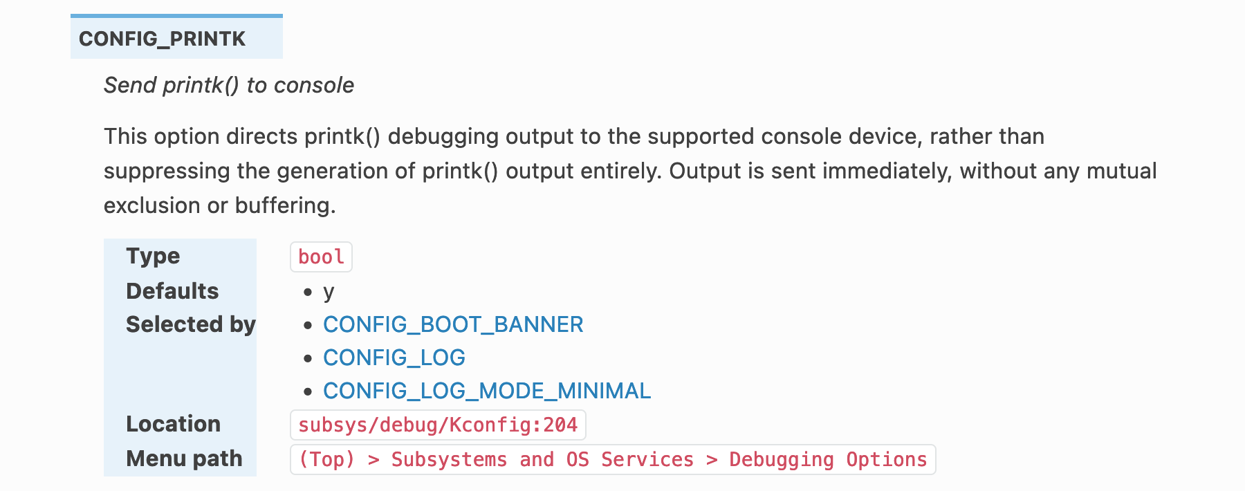 prj.conffile, we setCONFIG_PRINTK=n, but in the implementation, this translates to a missing definition, not a definition with a value ofn. This is simply what aboolsymbol translates to in the implementation. For details, I’ll once again have to direct you to the official documentation.
